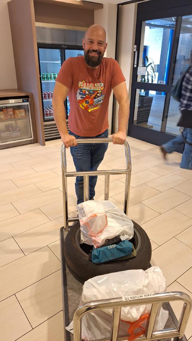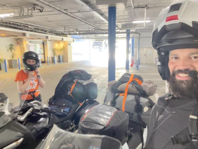 Tuesday morning, we were finally, finally (almost) ready to actually start our trek! While Clo figured out all the bells and whistles and secret compartments on her new BMW, I swapped the wheels, then set off to FedEx to ship home the old wheel along with the bonus parts for my other Futura.