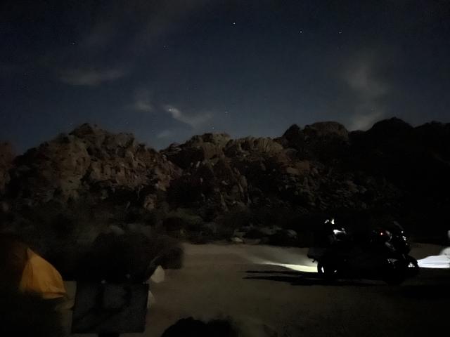 From there, on to Joshua Tree, our first (and ultimately, only) camping night of the trip. We got into the park super late, so we rode as slowly and quietly as we could toward our campground as the road gradually went from paved, to gravel, to soft sand. We were two sites from ours when Clo — slight of frame and still getting used to her massive 1200cc ride — slipped and dropped her bike in the sand. I yelled back to her to ask if she was OK (totally fine, only a mild ego bruise), then ran over to help her pick it up. At this point, a friendly camper (let’s call her Karen) came out to ask if we were all right. Once we reassured her that we weren’t hurt, something flipped in her and she launched into a tirade: “DO YOU KNOW THAT IT’S MIDNIGHT? PEOPLE ARE TRYING TO SLEEP HERE! IN TENTS!” We both resisted the urge to engage with her (remembering the adage: never argue with crazy!) and instead apologized and wished her a good night. Apparently even my “have a good night” was too loud for her, because she snapped back at us for talking too loudly before storming back off to her tent.