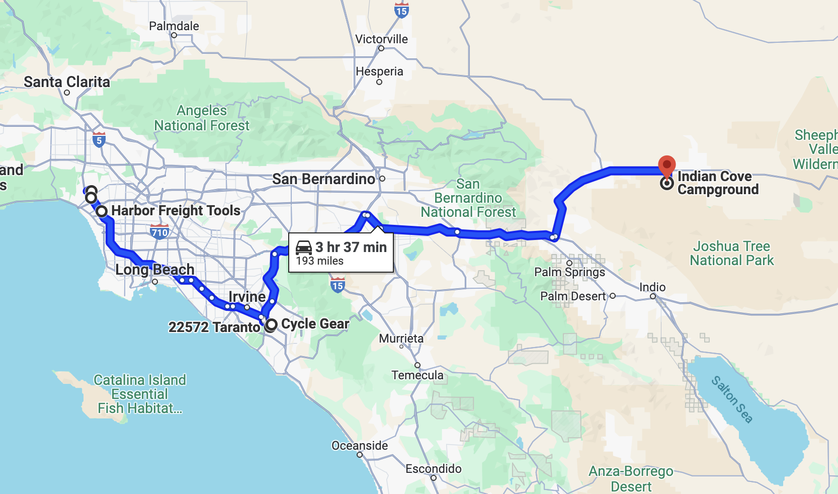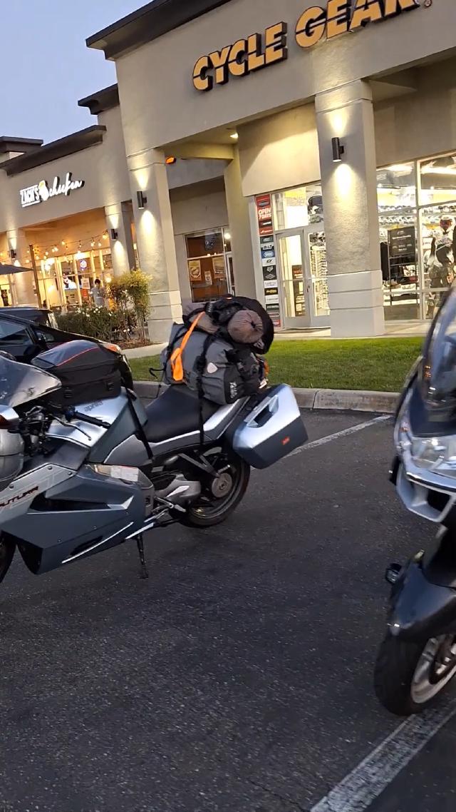 First, a few local stops in LA. We met up with Jess again, this time on the UCLA campus for lunch, then had some fantastic coffee with Lev at Coffee Commissary, but not before yet another Harbor Freight stop (returning some extra tools from the previous day, and buying batteries and a couple of Torx bits we needed for installing Clo’s phone mount). From there, we made a quick stop at Boomer’s house to pick up the tail bag he had forgotten to give to Clo when she picked up the bike, then a visit to the Laguna Heights Cycle Gear, where I tried (unsuccessfully) to return my improperly-sized oil filter and bought some touchscreen-compatible fingertips to attach to my heated gloves; I had accidentally brought my older pair that didn’t work with the phone.