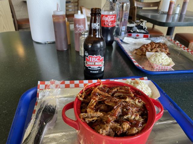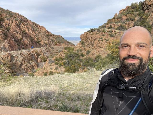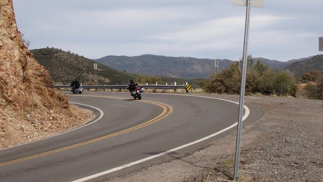 After a much-needed great night of sleep, we got in our first real twisty ride today! But before we hit the twisties, lunch at the Onery Hog in Wickenburg, AZ. This was one of those local BBQ joints where the owner (who’s also the cook!) will sit down at a table and chat up his customers. They’ve also got a lot of quirky art and tchotchkes on the wall.