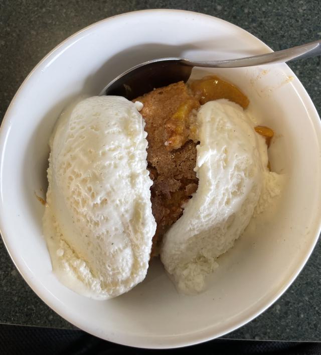 … but I couldn’t say no to peach cobbler with ice cream for dessert! Well worth the overfullness.
