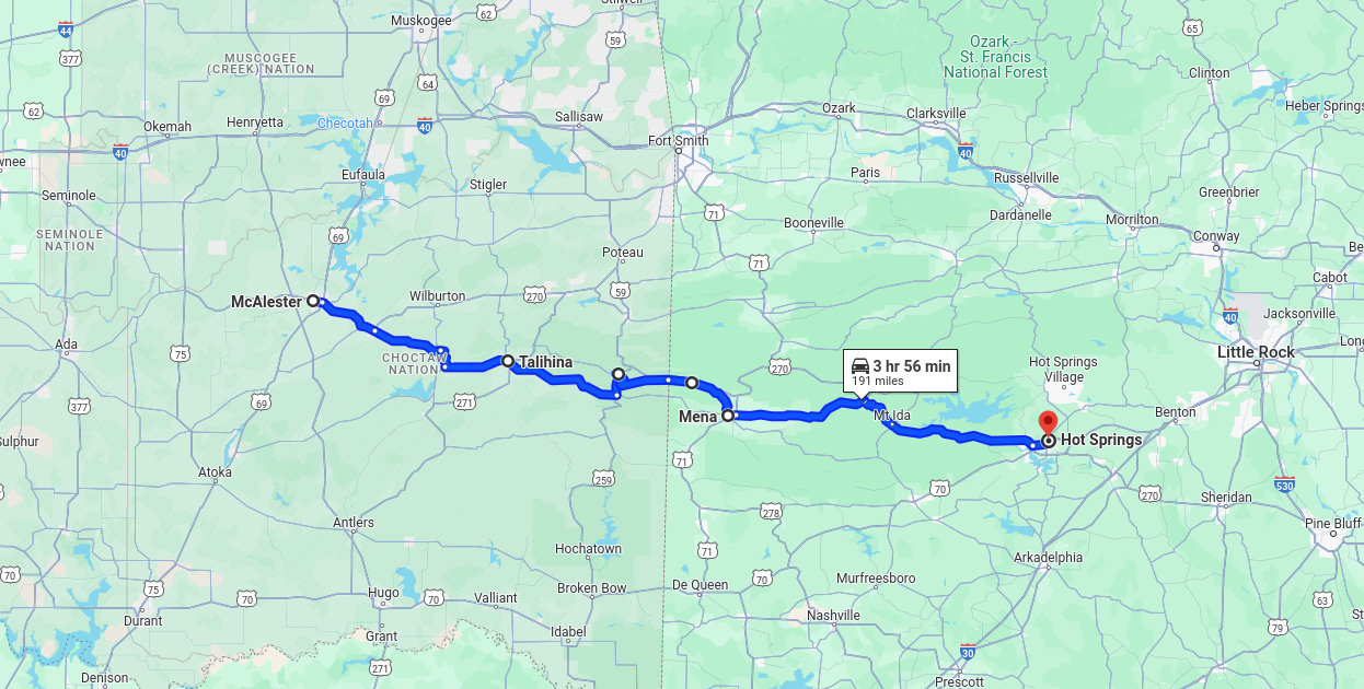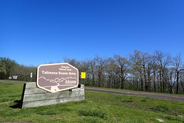 From there, we headed to Talihina, and then faithfully followed Google Maps to Mena on Route 63, which we thought was the Talimena Scenic Byway. It was pretty enough, but frankly kind of underwhelming. About halfway to Mena, I spotted a sign that said “Scenic Byway ←” — turns out we had accidentally taken a less-scenic shortcut! We turned, hopped on OK-1 — the actual Talimena Scenic Byway — and it was fantastic. Breathtaking views from the many overlooks, and gorgeous twisty roads.
