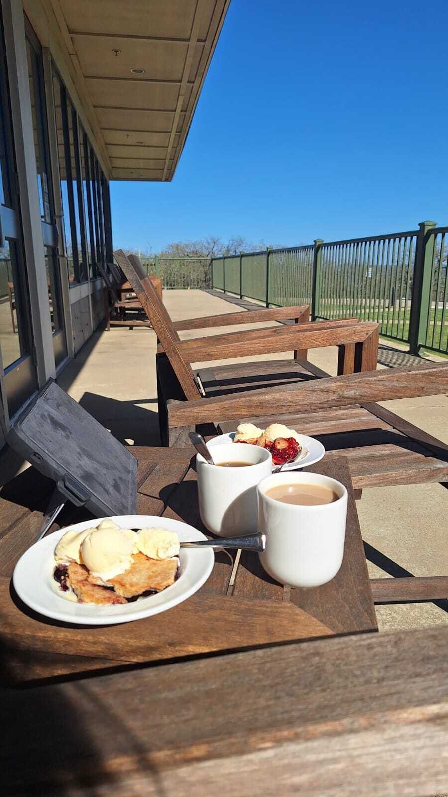 The weather today was absolutely perfect: high 60s-low 70s with clear skies and a light breeze. We made a stop at the Queen Wilhelmina Lodge in the eponymous state park — named in honor of teir queen by Dutch railroad investors — for a bathroom break and coffee paired with cobbler and ice cream.