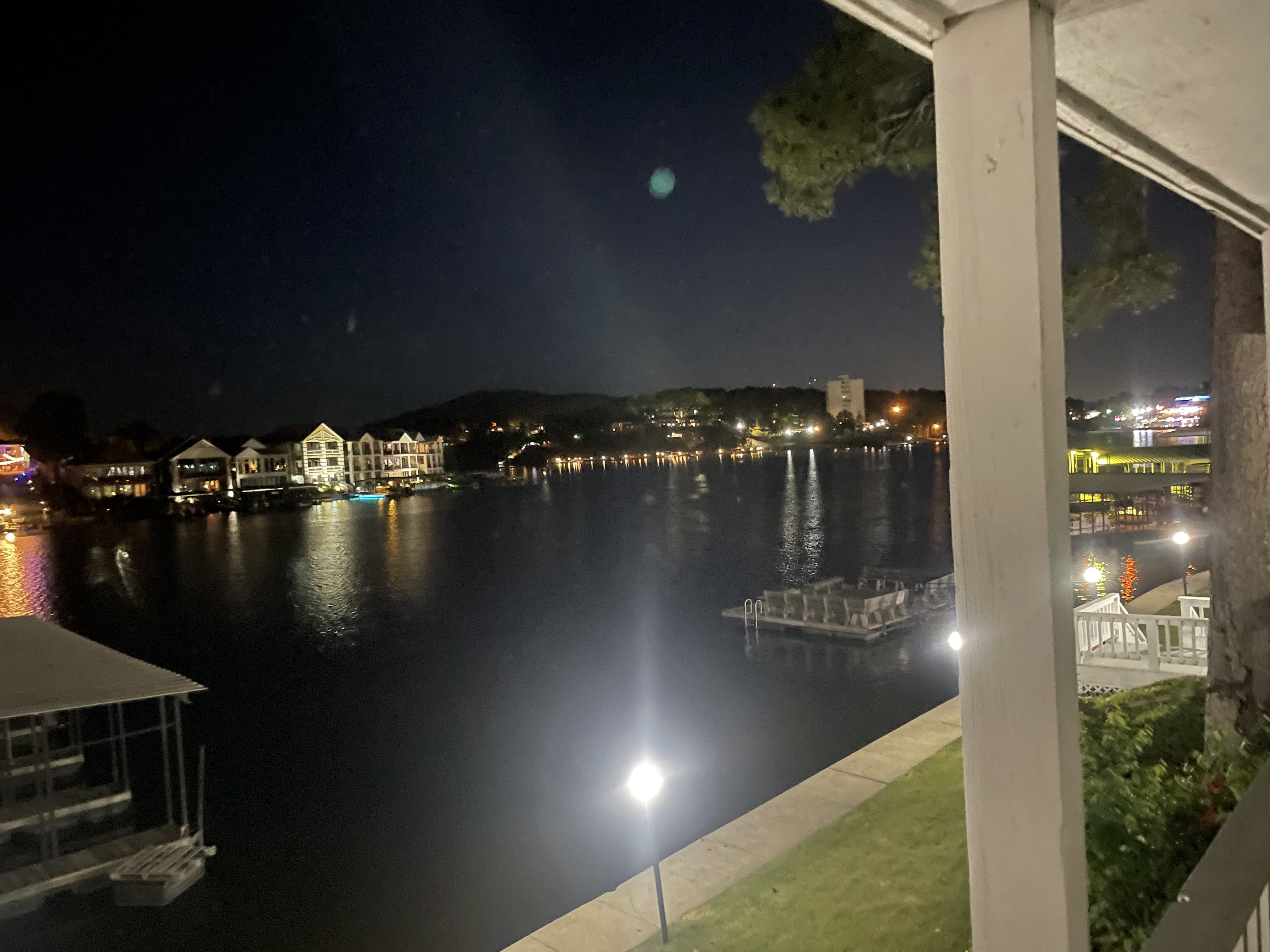 We looked for hotel in Hot Springs, and Clo found The Hamilton, a motel which got great reviews. I was a bit skeptical — how great could it be for $84 a night? — but it turned out to be fantastic. We arrived just after sunset, checked in, and got to enjoy this view from our balcony over takeout burgers that I picked up from Boondock’s Billiards just across the street.