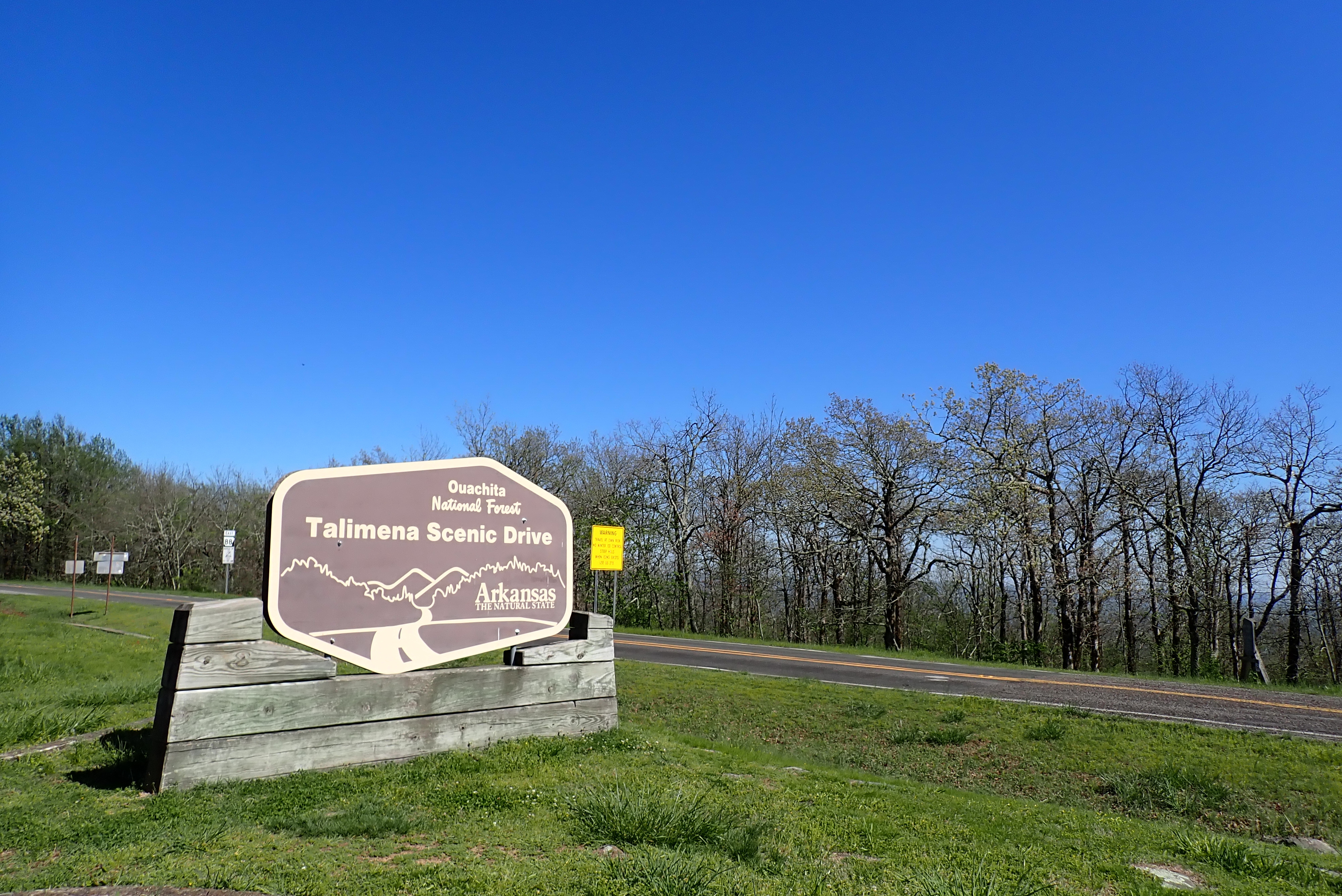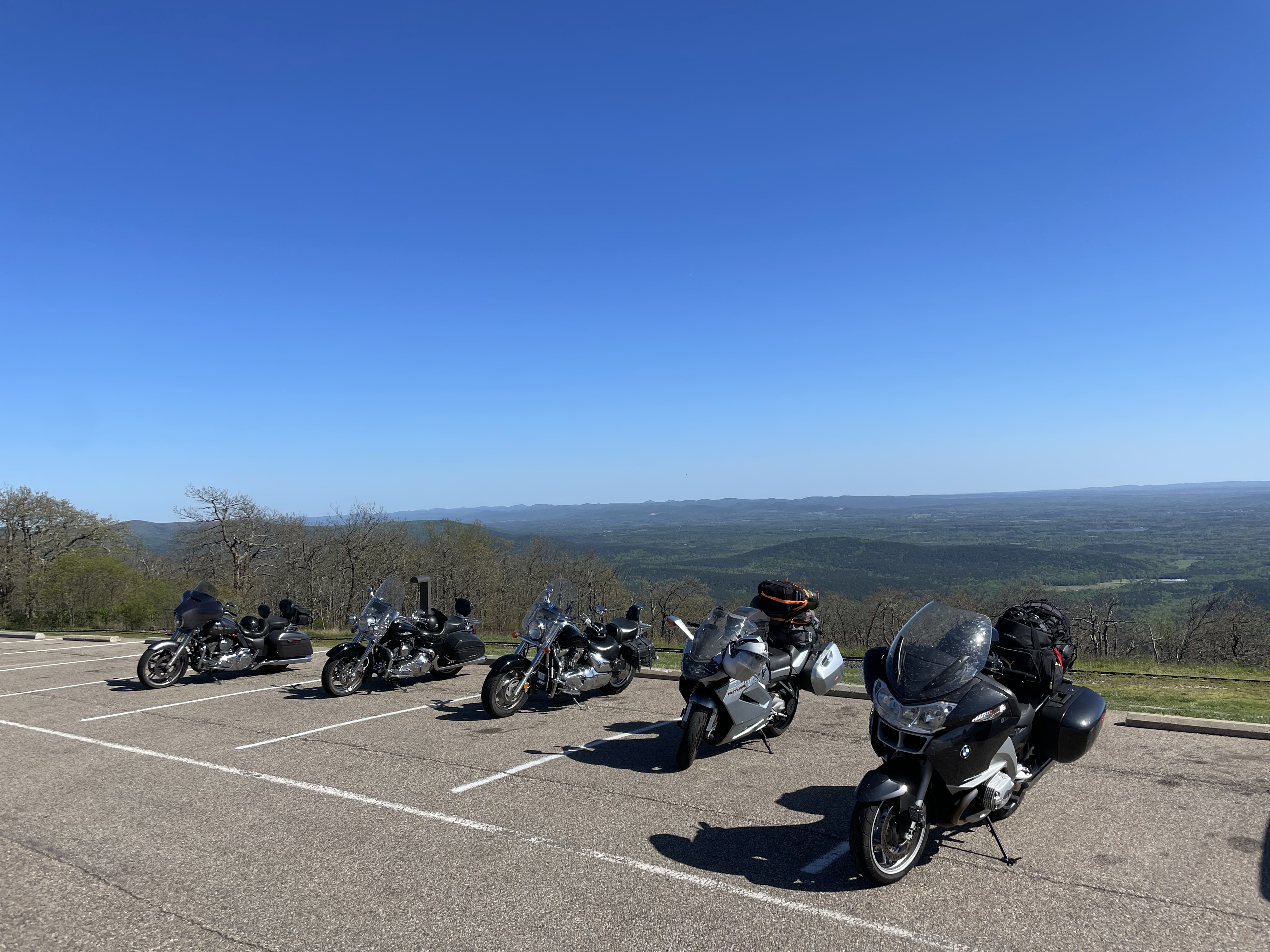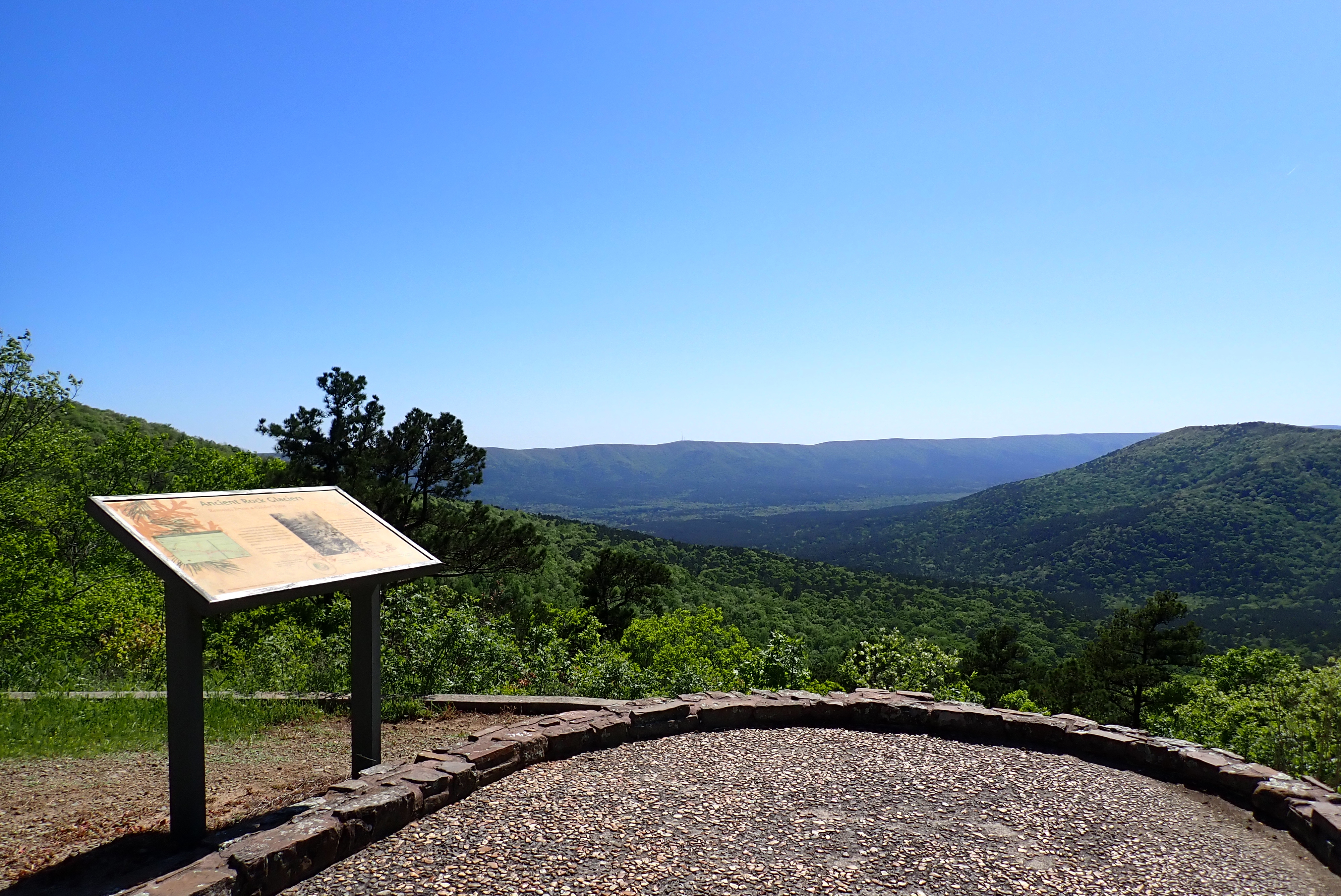 From there, we headed to Talihina, and then faithfully followed Google Maps to Mena on Route 63, which we thought was the Talimena Scenic Byway. It was pretty enough, but frankly kind of underwhelming. About halfway to Mena, I spotted a sign that said “Scenic Byway ←” — turns out we had accidentally taken a less-scenic shortcut! We turned, hopped on OK-1 — the actual Talimena Scenic Byway — and it was fantastic. Breathtaking views from the many overlooks, and gorgeous twisty roads.