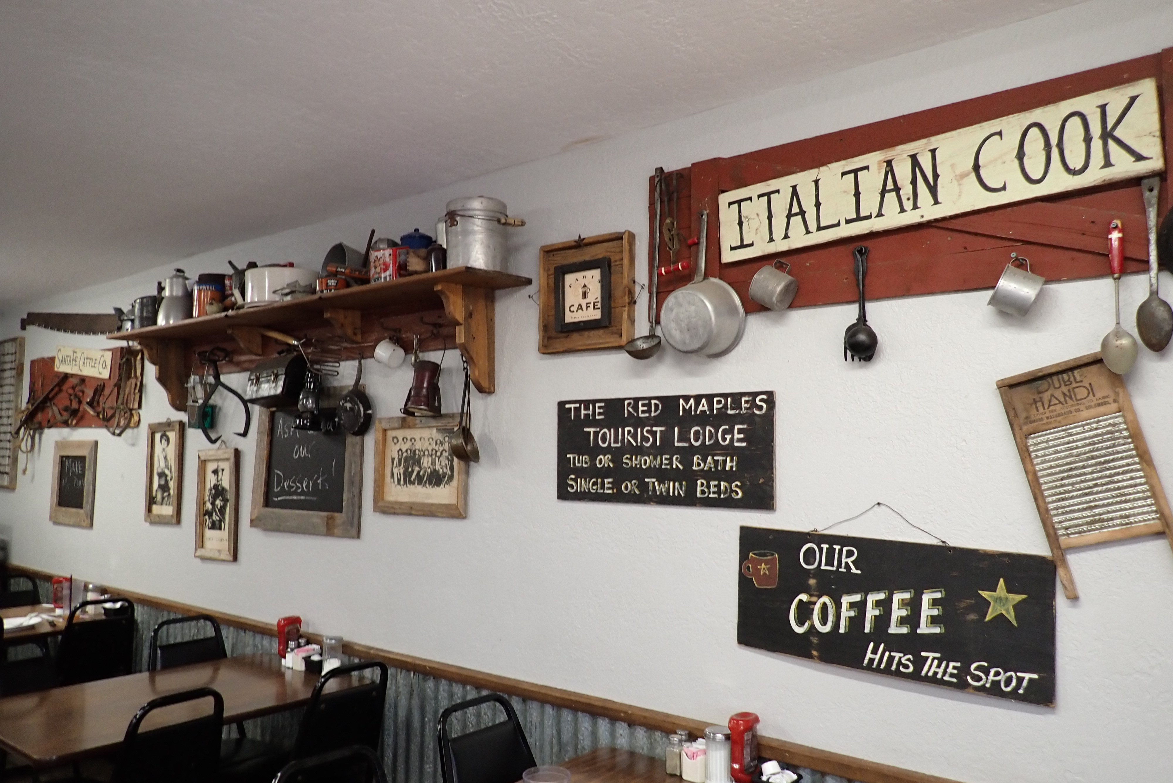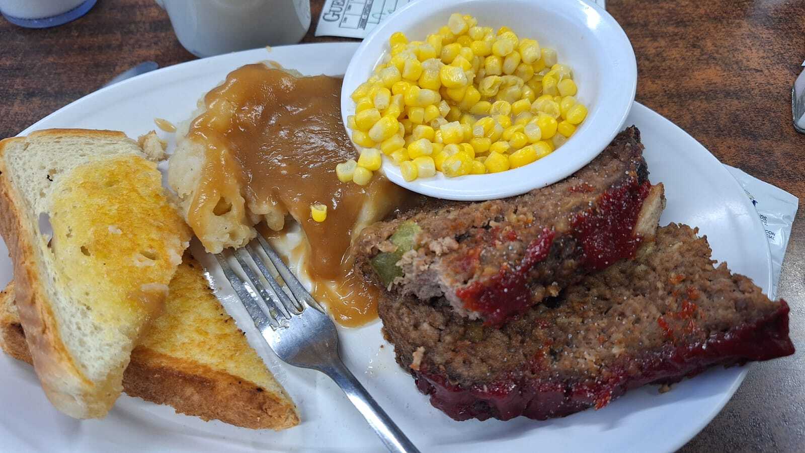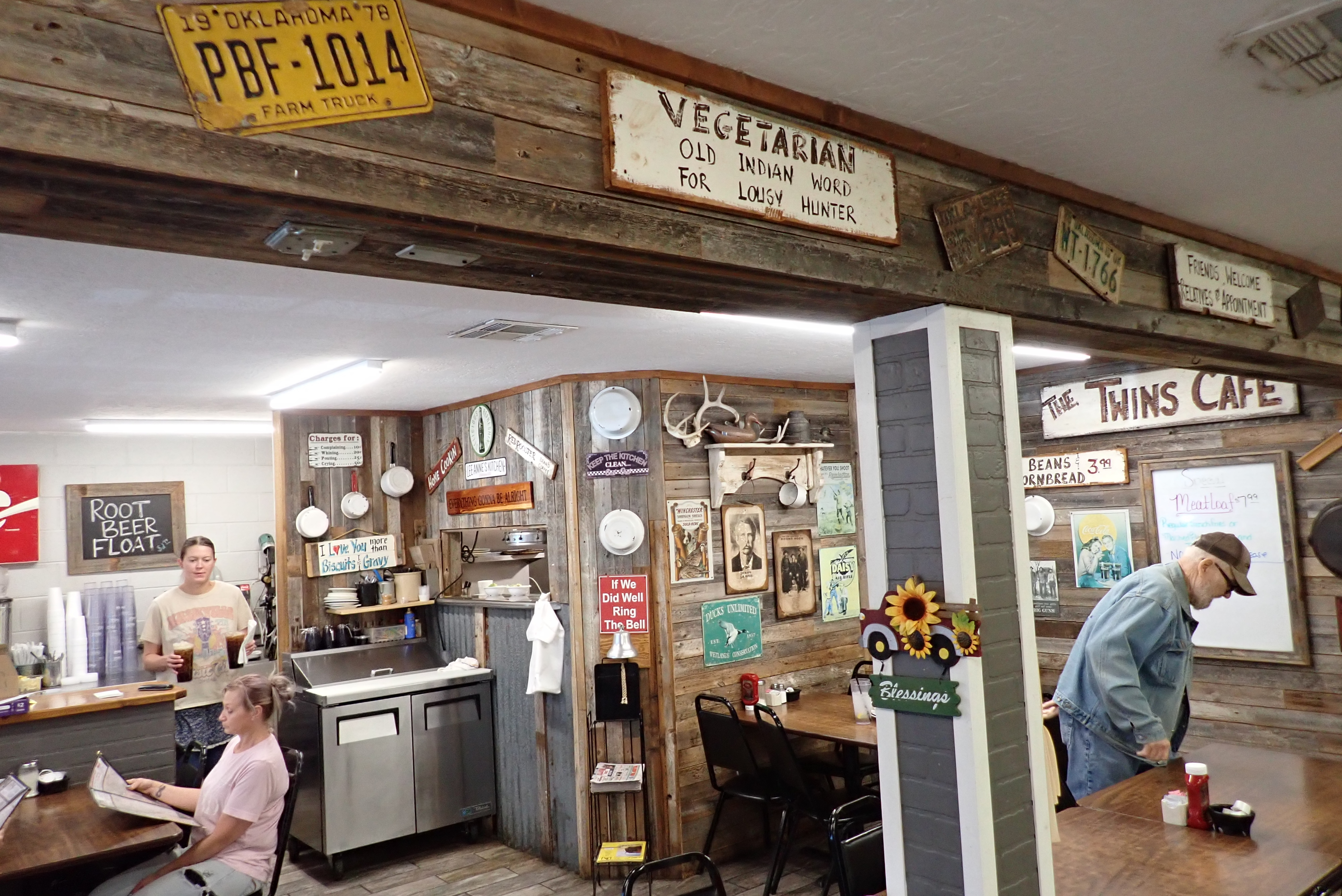 With the electrical issues fixed, we were finally on the road. Well, almost. I had to stop at Walmart to buy some clothes, and by then it was lunch time, so we stopped at Twins Cafe in Haileyville, OK. The meatloaf special was phenomenal!